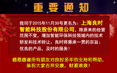 重要通知:我司与2015年11月30号更名为:上海良时智能科技股份有限公司,除原来的经营范围不变,增加智能环保科技领域内的技术研发和技术转让。良时将秉承一贯的宗旨:优良的产品,及时的服务!感恩感谢所有朋友对良时多年的支持和帮助,恭祝大家吉祥安康,财源滚滚!